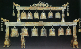 和田玉は、その性質から昔から神聖化され多くの工芸品が生まれてきました。 玉を叩くと清くて響きの良いきれいな音が出るため、昔から(中国の商代以後)打楽器として使われていました。 特に質の良い玉は余韻が低く遠くまで響き消えてはまた聞こえ、徐々に消えていくと言われています。 秦の時代では皇帝が、腰からぶら下げ歩くことで、皇帝の存在位置を音で表現したとも言われています。